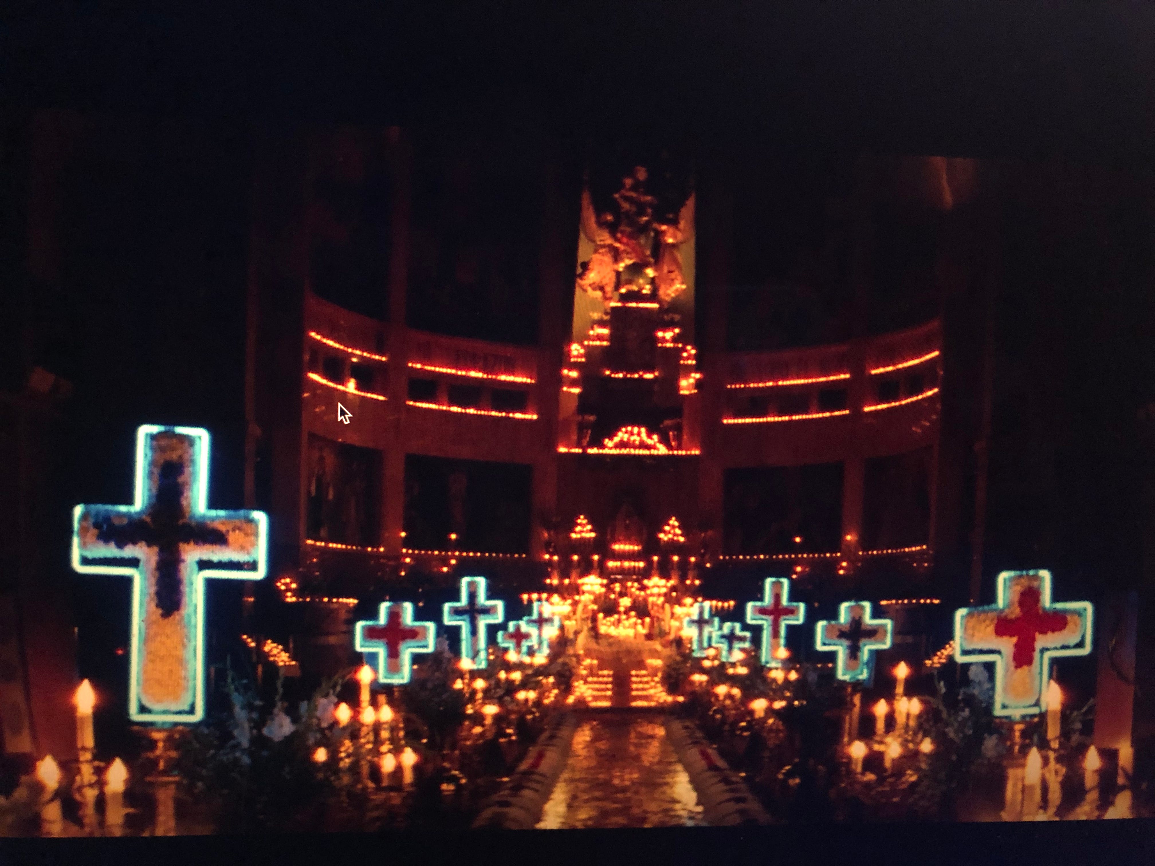 As the door opens, it reveals an image of unexpected beauty. The velvety black cavern of the church is glowing warm with hundreds of lit candles (133).